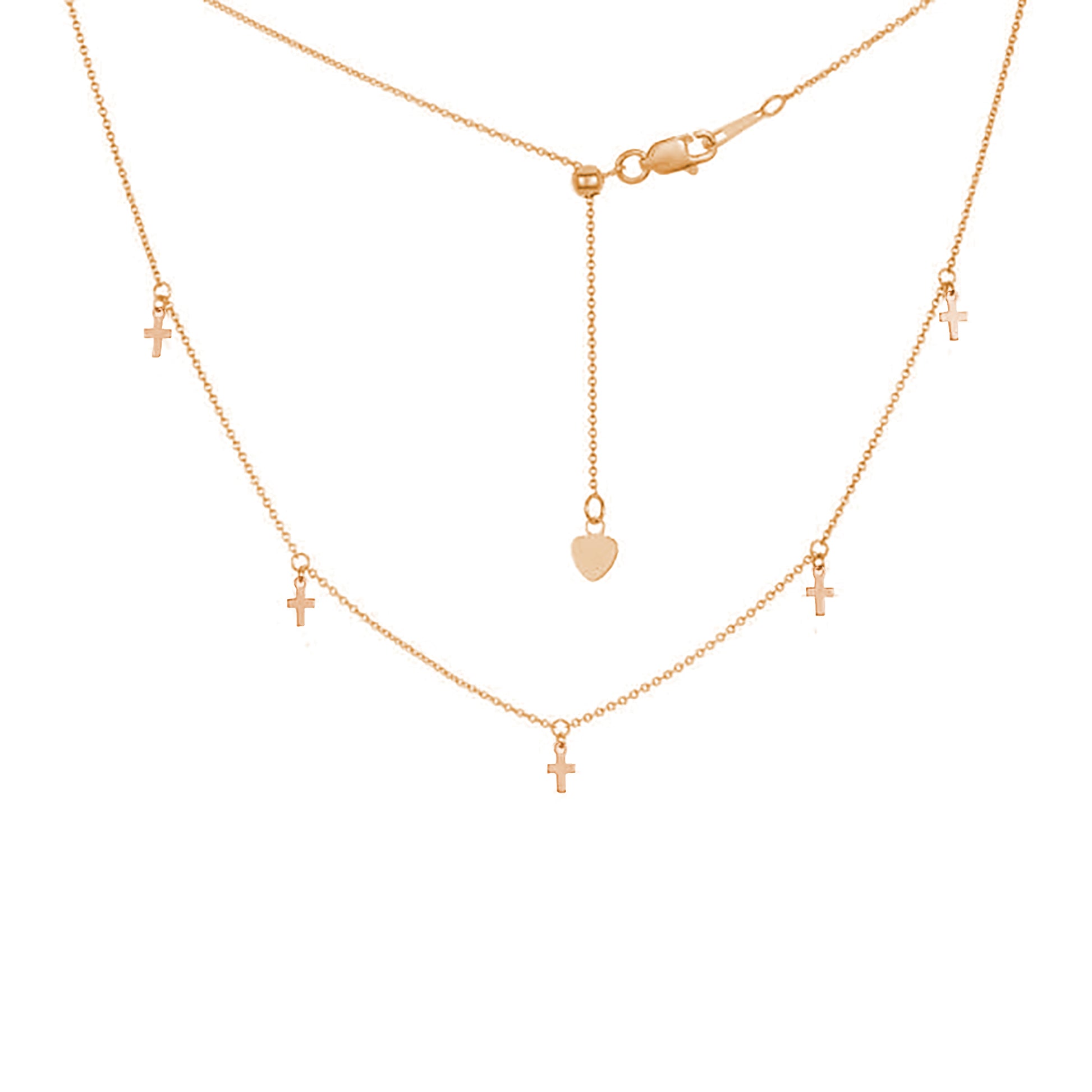 Tastefully placed five mini cross charms on a rose gold adjustable chain. Can be worn alone or in addition to other necklaces and pendants.