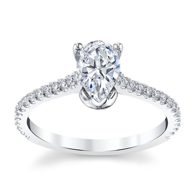 Simple and elegant prong setting, pear shaped diamond engagement ring in 14karat white gold. This ring can be made in different colored diamonds or gemstones.