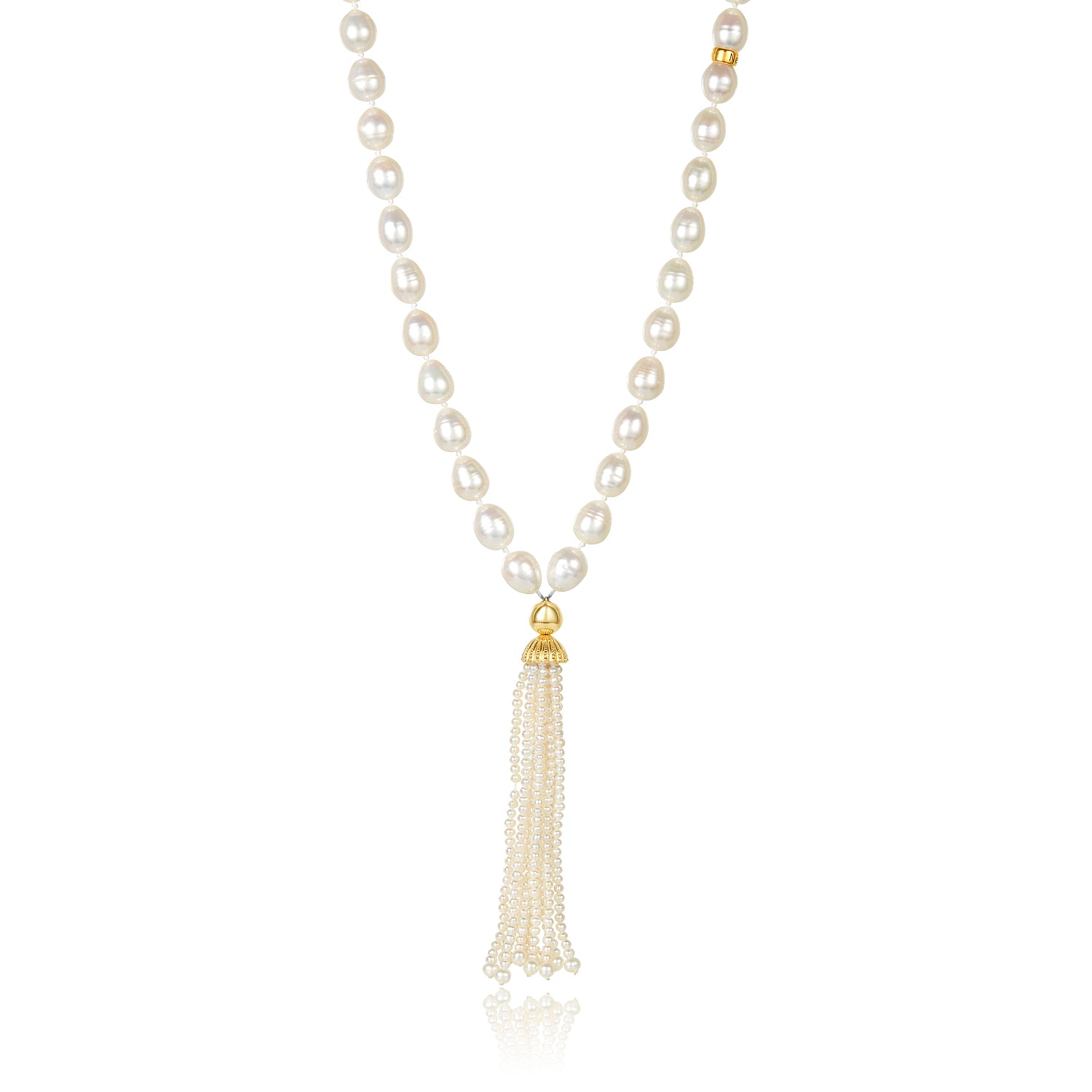 Single strand of fresh water pearls, knotted individually, with 14 karat yellow gold