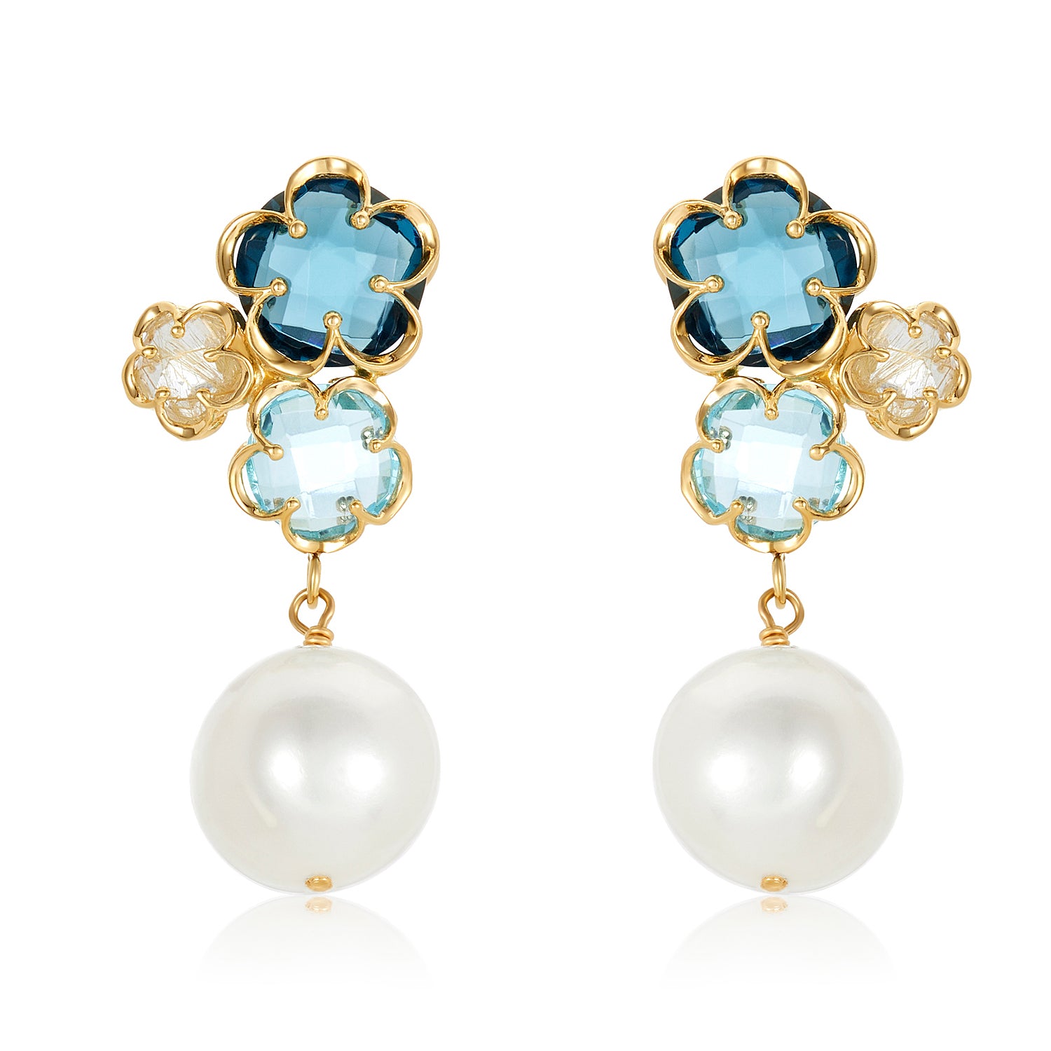 These exquisite round freshwater pearl drop earring add a floral look to your collection, with our pretty daisy triple gemstone. The perfect gift for weddings, birthdays, holidays or anniversaries. These earrings are so elegant, she will treasure them forever