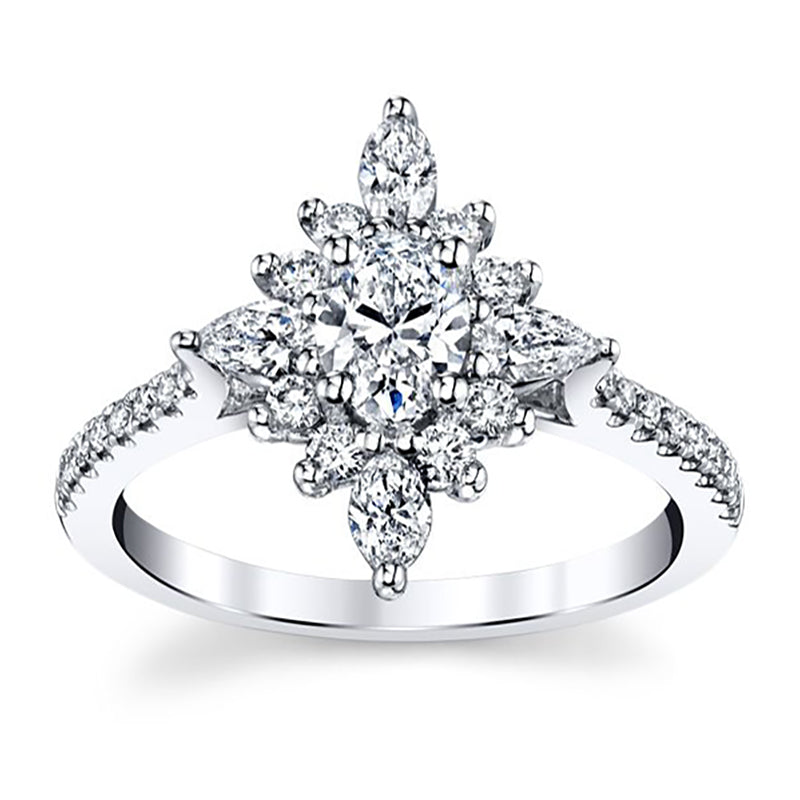 An array of various shapes of diamonds, round, oval and pear shape set around a .85 carat of beautiful oval white diamond to give the center stone a beautiful sparkle. This is the beginning of an everlasting love story. This ring can be set with any colored gemstone of your choice.