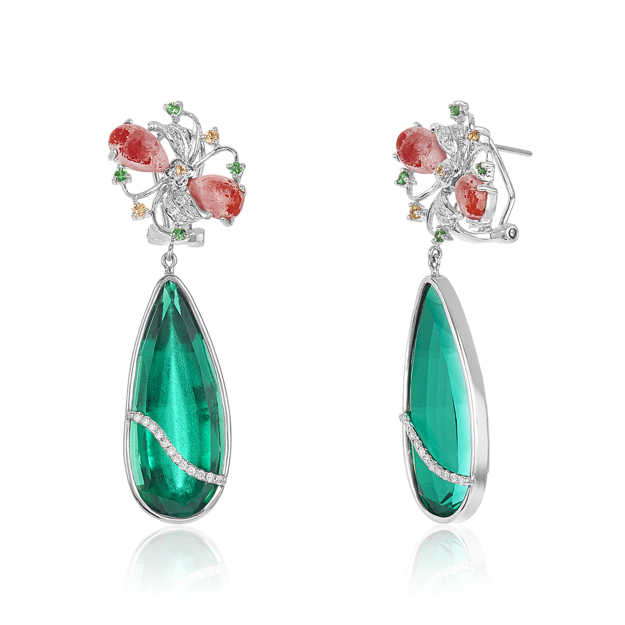 Beautiful tear drop cut shaped green Garnet and Coral set in 18 karat white gold with round brilliant Diamonds for effortless elegance