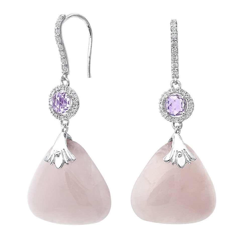 Rose Quartz, Amethyst and Diamond earring set in 18 karat white gold versatile and easy to wear everyday